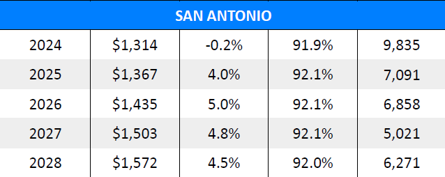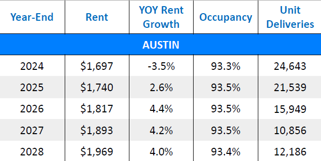 • Projected recovery of occupancy and rent growth in Austin and San Antonio starting in 2025.